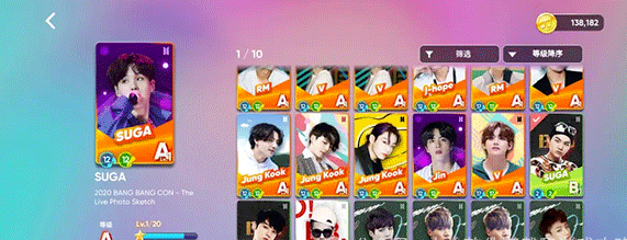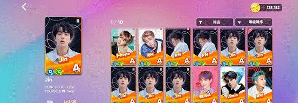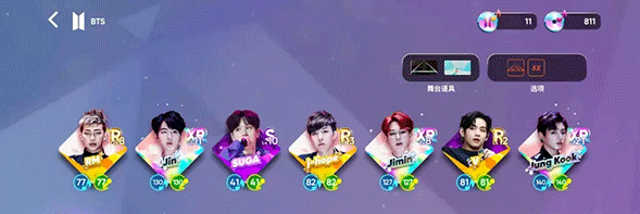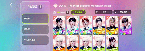 比如我这里Boy With Fun形成这样阵容的原因,就在于bang bang con和花1 dope的主题卡都可以演出Boy With Fun,但Suga和V的卡片在花1 dope中的级别低于在bang bang con中的级别