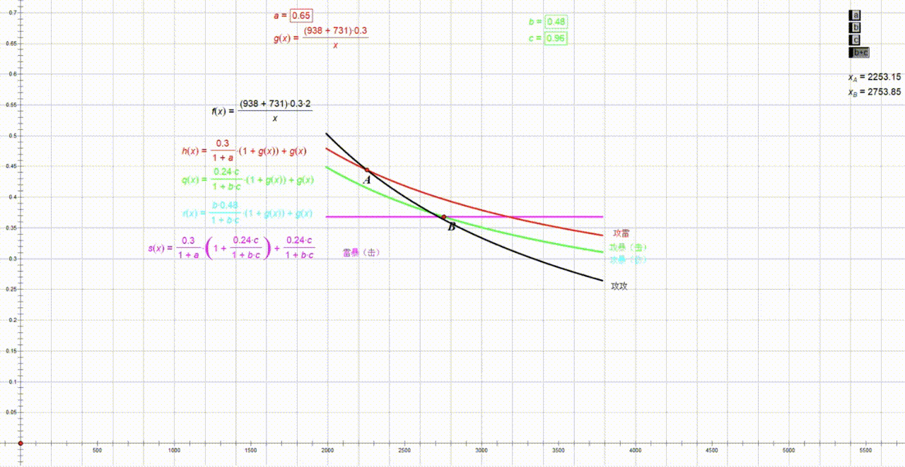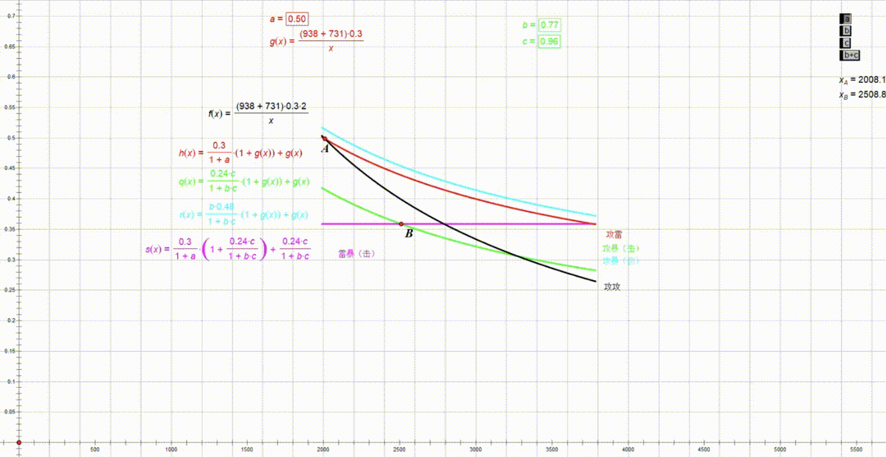 如图,随着增伤区数值不断升高,攻暴(击)和雷暴(击)的临界攻击力(B点横坐标)越高。当a=0.65时,B点横坐标约为2754,实战中堆到2754攻击力并非难事,故普遍情况下雷暴(击)收益较高