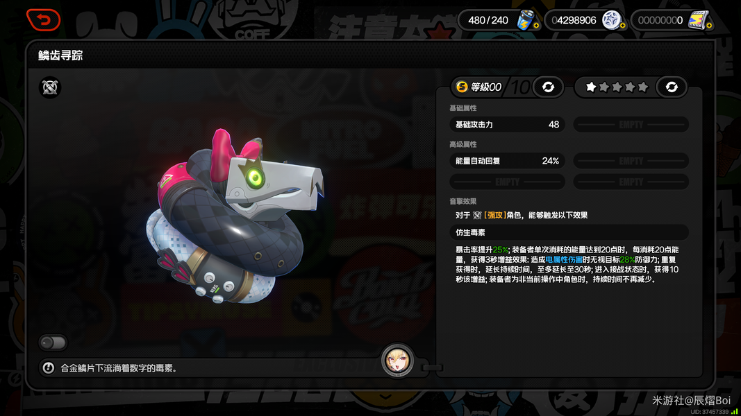 提供731基础攻击力和60%能量自动回复加成;被动使暴击率提高25%,装备者造成的电属性伤害无视敌方28%防御力