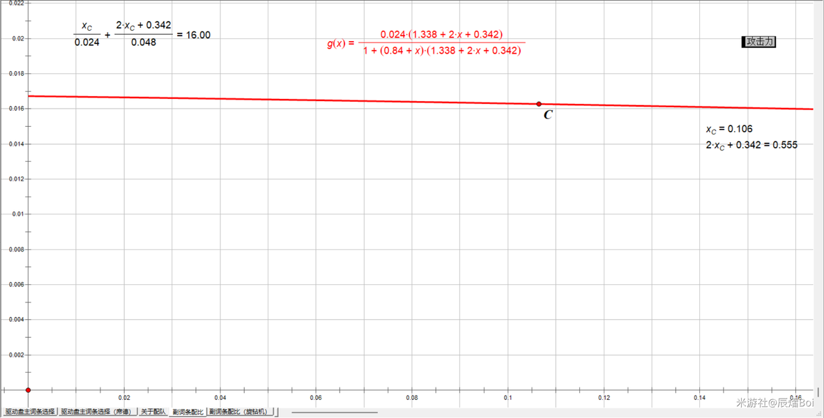 当前希希芙已有2235???点场内攻击力、84%场内暴击率、133.8%场内暴击伤害。设暴击率加值为x,暴击伤害加值为x?,则2(x?+0.84)=1.338+x?,即双暴关系式为