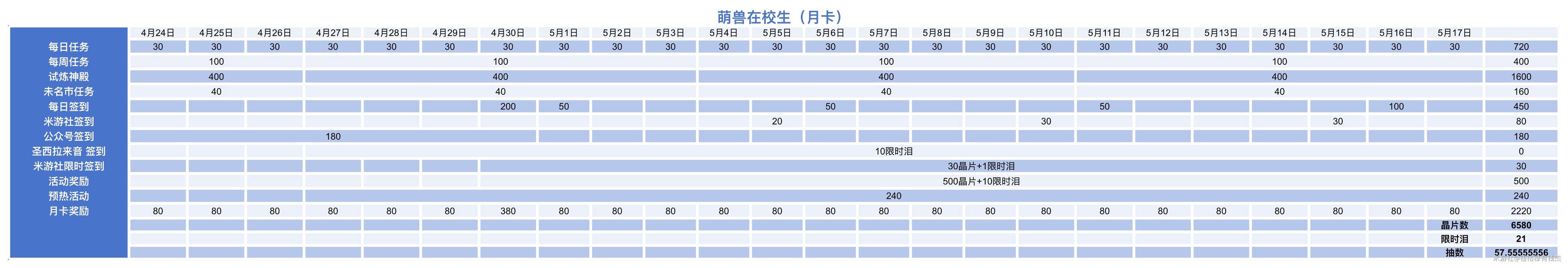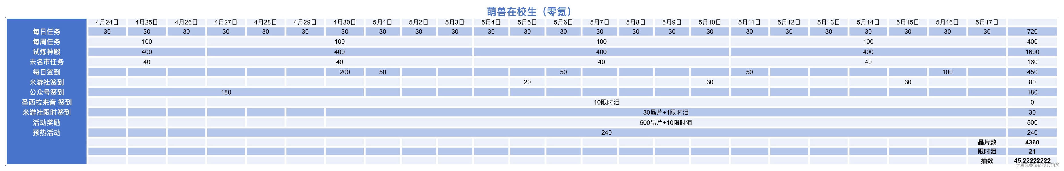 从4月24日开始计算,到5月18日凌晨四点活动结束,我们能攒的抽卡资源如下: