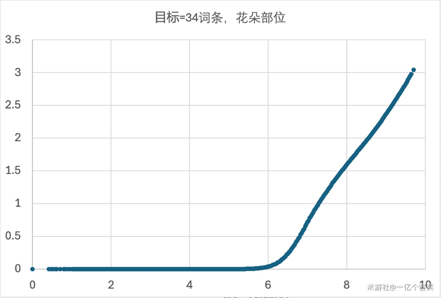 对比一下目标为34词条,显然,34词条对花的要求要高得多。6词条的花,对于24词条的目标而言已经很有价值了(0.7),但对34词条的目标而言价值很低(0.04)。而满词条的花,对于34词条的目标而言,价值反而比24词条更高(3>2.5)