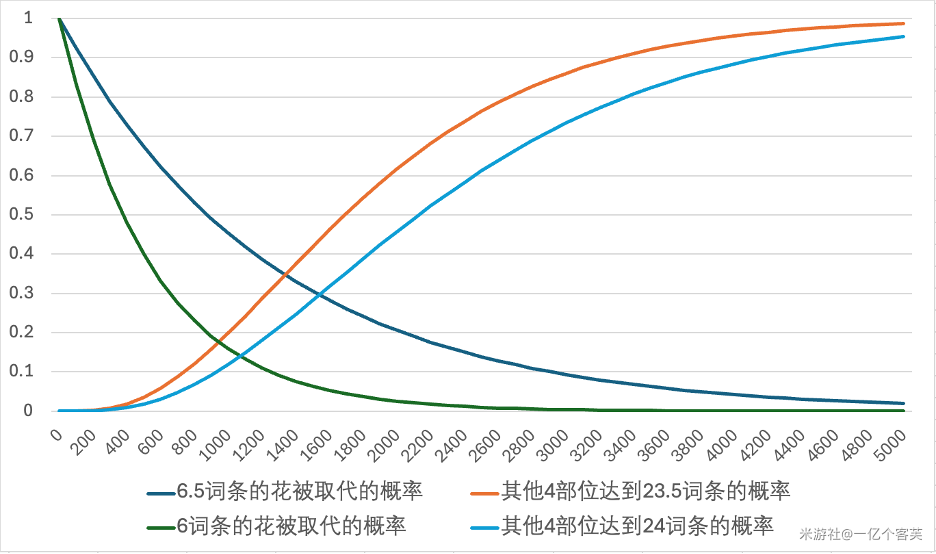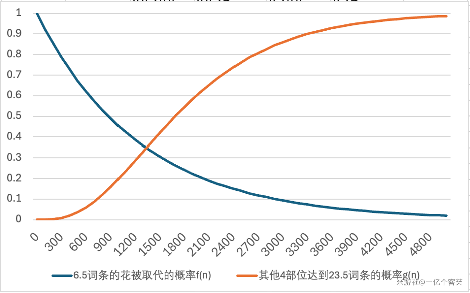 以及比较容易得出,6.5词条的花不被取代的概率-刷取曲线是f(n)=0.9992^n,两条曲线叠加到同一个图中。这里也放上剩余4件目标24词条和6词条的花的对应数值: