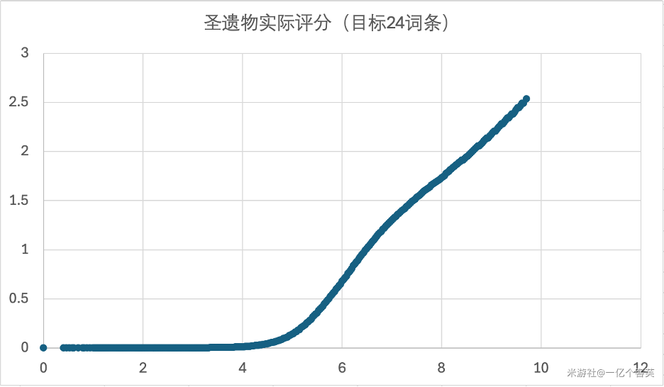 这便是这件圣遗物“被取代的概率”。配上我们之前计算得到“这件圣遗物可以在多大程度上加快毕业”,便可以得到最终的评分。大致形状如下: