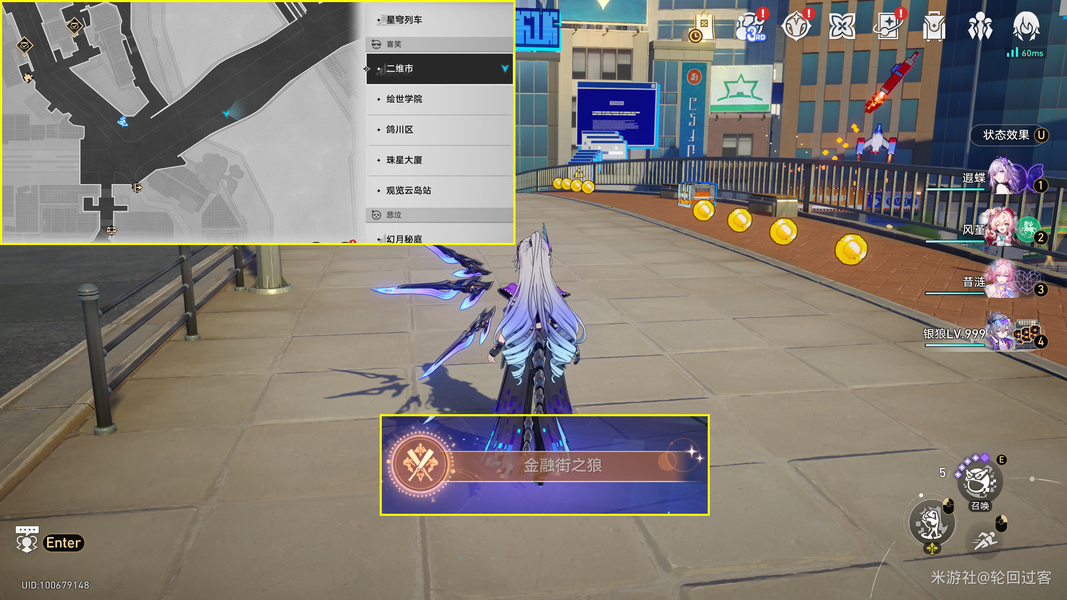 这个目前必须抽到银狼LV999才能完成,来到下图二维市所示位置,这里的大桥上有8个金币,银狼LV999开秘技吃就能完成了。