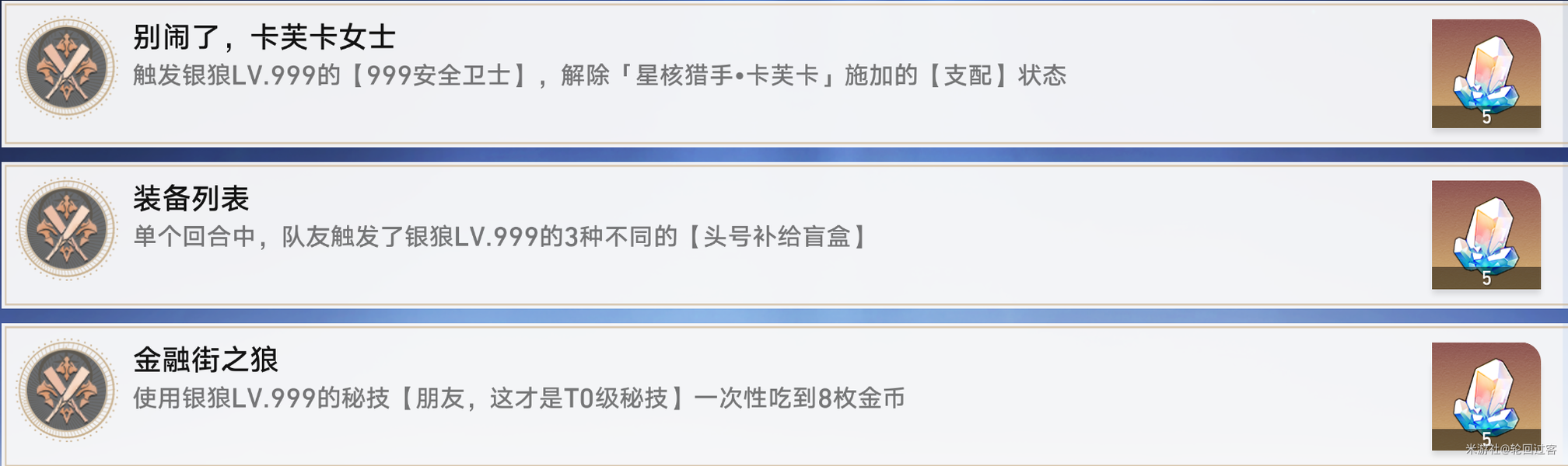 《崩坏:星穹铁道》4.2版本中,银狼LV.999拥有三个隐藏专属成就。其中前两项可在货币战争模式内完成,无需另外配置队伍即可触发。第三项“金融街之狼”则需要玩家实际持有银狼LV.999角色才能解锁,要求银狼在一场对局中打出四次连续追击并成功击杀敌方首领。