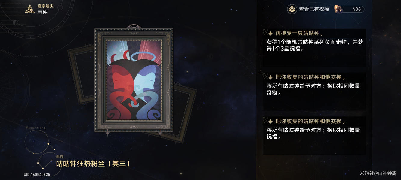 前面刷到其二选择了再接受一只咕咕钟,后面在奖励区一直不出其三,于是想着在事件区再刷一次其二选择放弃,然后就在(巡猎命途)事件区刷到了其三,当时身上就一个咕咕钟奇物。