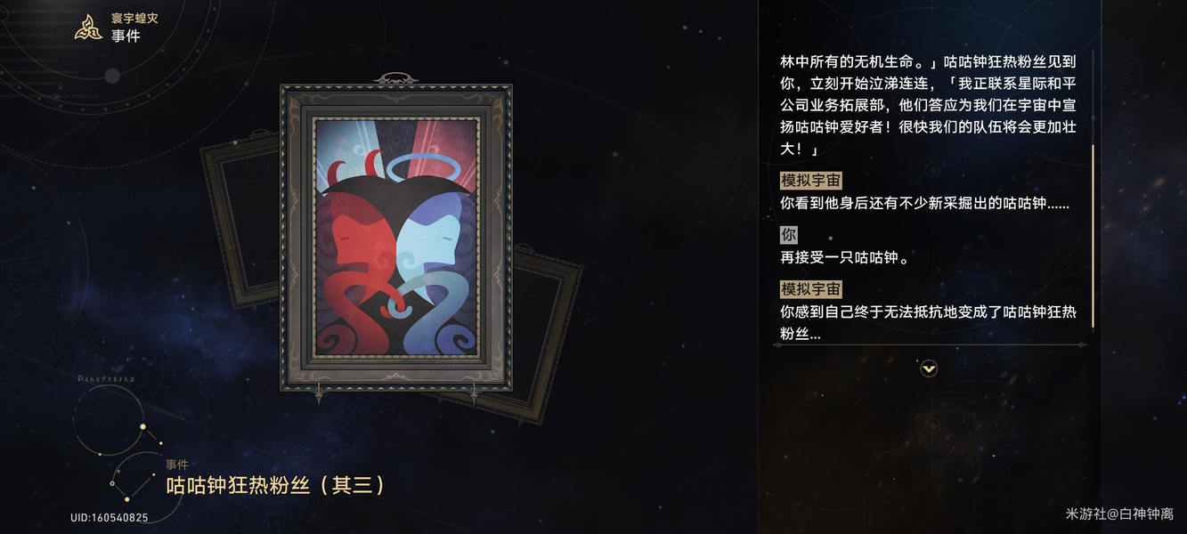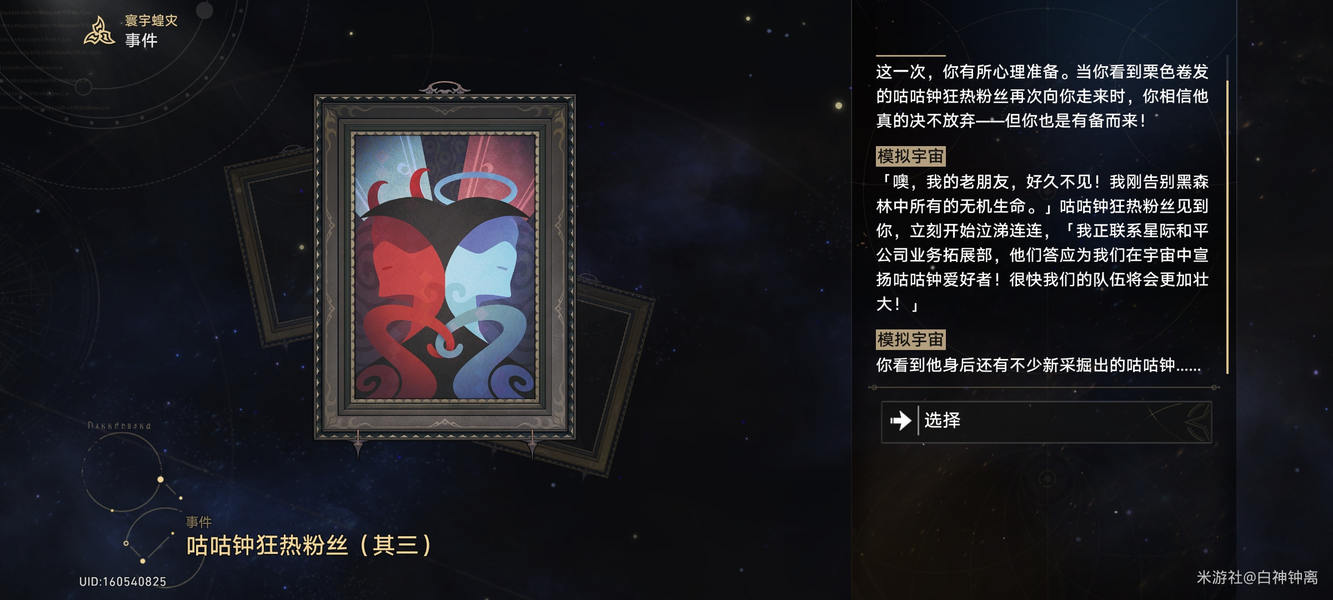 崩铁与某位角色相关的隐藏事件“咕咕钟狂热粉丝”系列共有多步骤,其中第三环的触发率相对偏低。玩家在特定地点反复刷取时,是否触发该事件取决于当次随机出的选项组合是否为特定序列,属于较难自然遇到的情况。建议有需求的开拓者预留一定耐心,只能通过反复进入了。