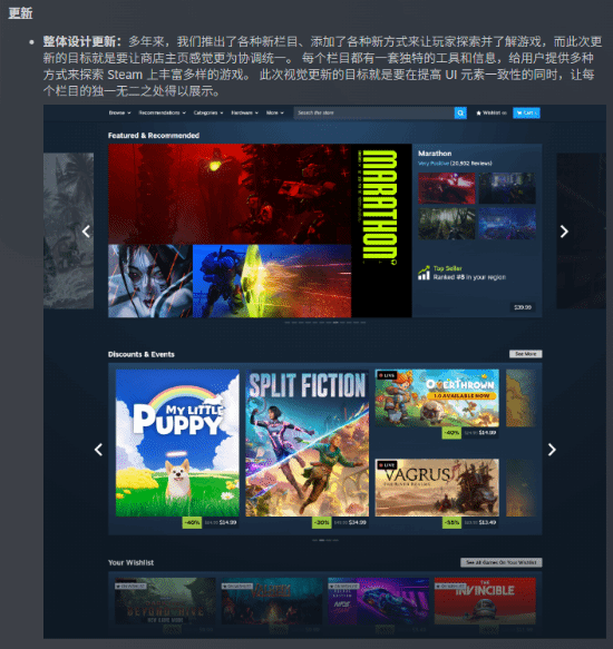 按照官方的说法,全新的布局旨在通过展示更多内容和信息让玩家更容易找到新游戏。 我们同时还会展示更高分辨率的游戏艺术作品,提供更好的视觉清晰度。 如果玩家使用的显示器分辨率较高,就可以看到新的商店主页更宽,响应也更快。 如果是在 Steam Deck 或大屏幕模式下查看商店主页,也可以看到这些更新。