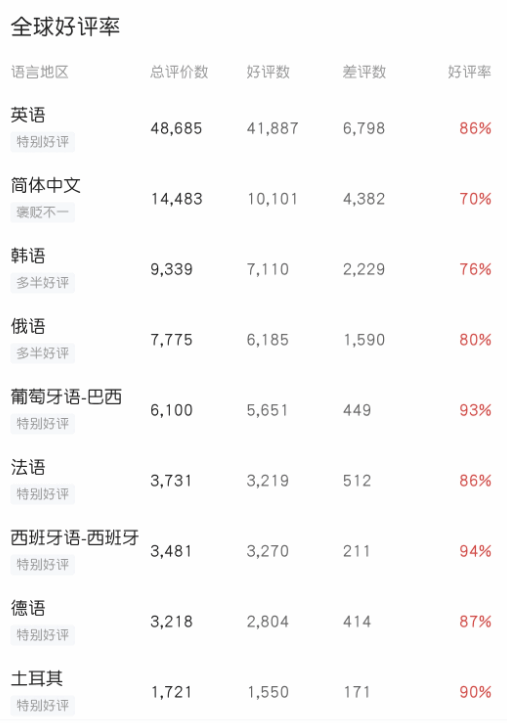 韩语区: 作为“主场”,好评率为 76%,处于“多半好评”状态。