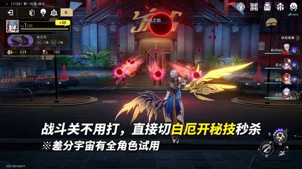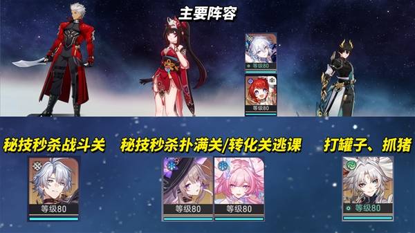 我们主玩的阵容为“Archer+花火+爻光/缇宝+腾荒”,由于差分宇宙给了3.8版本前的角色试用,不必纠结缺角色怎么办这种问题,用就完事了,主要靠BUFF给数值,角色本体练度影响有限,充当机制发射器。