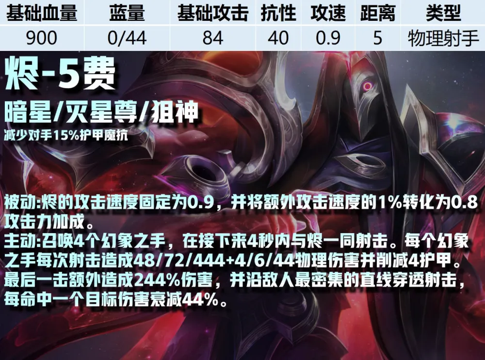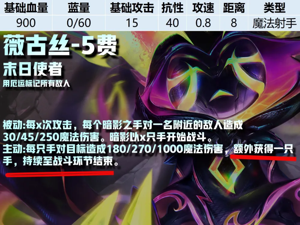 独立羁绊是标记所有对手造成厄运。赛季有一个幸运属性:暴击计算两次,如果有一次暴击按暴击计算。厄运的话就应该是反过来。技能是无限叠加更多的手,属于羊刀叠起来越来越强的那种卡。