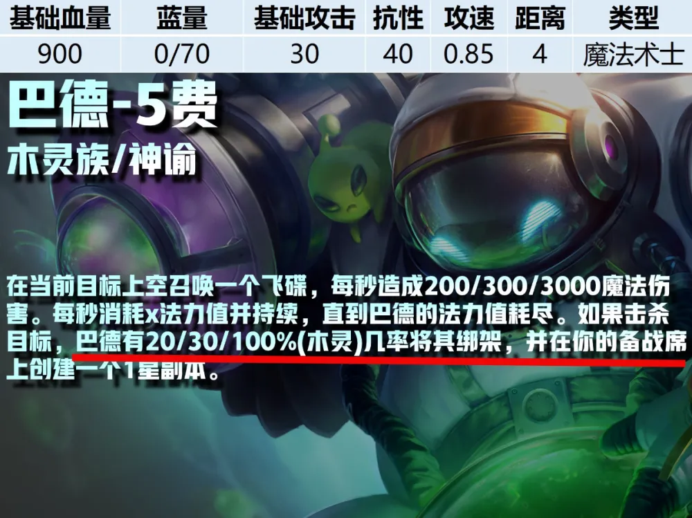 外星人的友谊是他把你当朋友,就会把你绑架。巴德的技能是发射宇宙飞船转啊转的造成魔法伤害,五费三星就是真实伤害直接秒杀。同时把秒杀的棋子偷过来,并且有概率直接偷出三星。目前来讲他大龙也能偷,甚至可以直接偷一个三星大龙——代码不改的话,好玩是真的好玩。