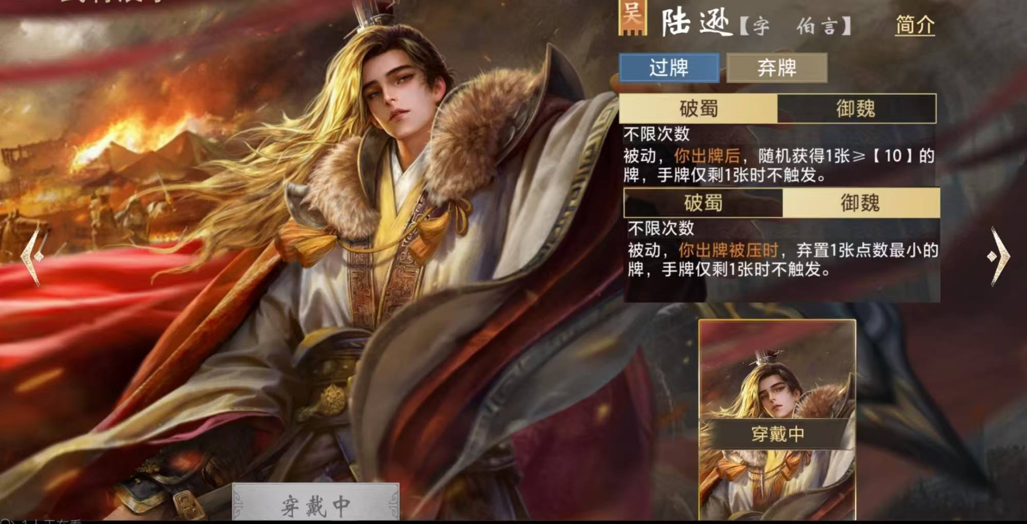 首先我们要了解陆逊的两个主要技能,技能“破蜀”能在出牌后随机摸一张点数≥10的牌,而“御魏”则是在出牌被压后弃掉一张最小牌,由此可见陆逊有着优秀的弃牌和过牌能力,这样的机制使得他当地主时优势很大。