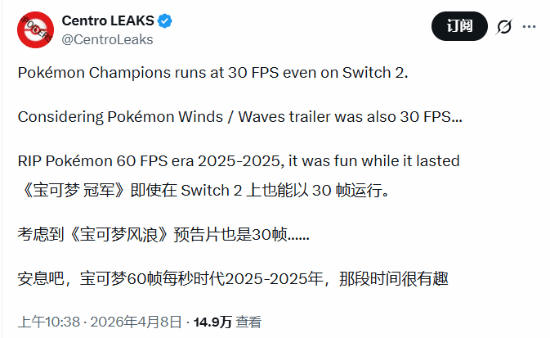 该博主在社交媒体上感叹道:“《宝可梦冠军》在 Switch 2 上也是 30 帧。考虑到之前《宝可梦:风/浪》的预告片也是 30 帧……看来宝可梦的60帧时代结束了,这真是令人遗憾。”