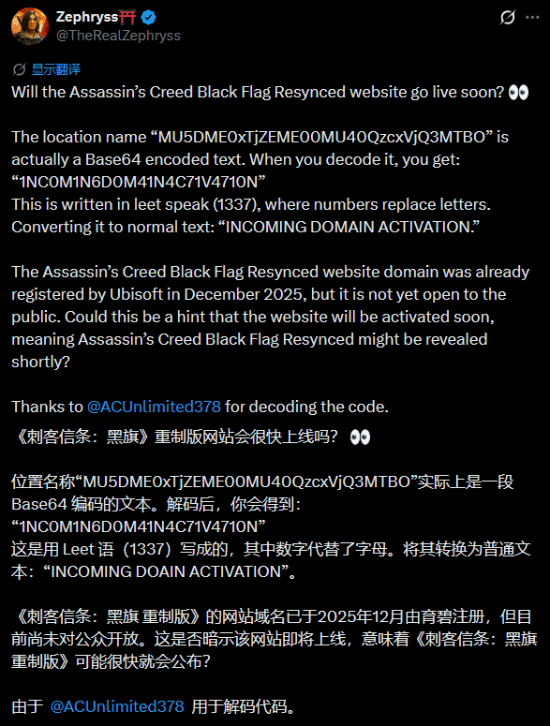 两大《刺客信条》粉丝社区(Isu Network与The Ones Who Came Before)的社交媒体管理员Zephryss敏锐地指出,这一线索很可能和育碧前一段时间注册的《刺客信条4:黑旗 重制版》域名有关。