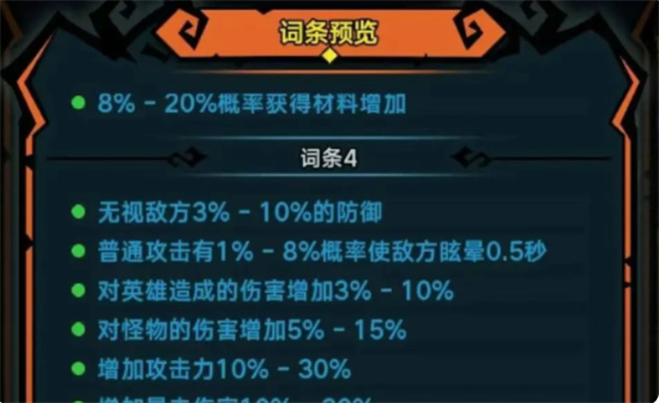 1.武器四词条:破甲、晕、英雄伤害增加、怪物伤害增加