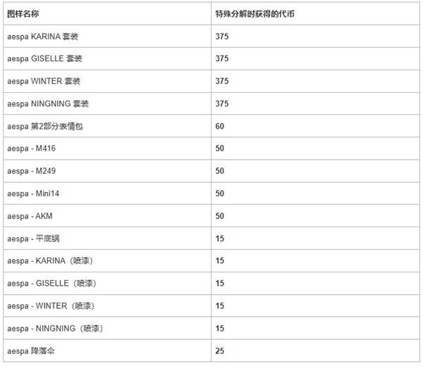 将 aespa 典藏箱里可获得的道具图样进行特殊分解,可以获得 aespa 代币。