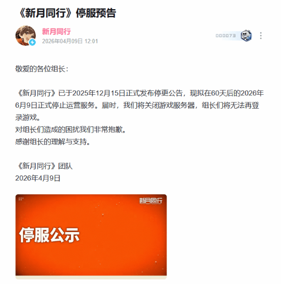 去年我们曾报道,《新月同行》官方宣布在“审慎的考量”,游戏将于2025年12月15日版本更新后正式停止后续内容更新。不久之后,官方又在12月31日公布了退款方案。