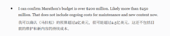 《马拉松》的开发成本最近被曝。根据福布斯记者的爆料,这款名为《失落星船:马拉松》的游戏,开发费用已经突破了2亿美元大关,甚至有可能已经摸高到2.5亿美元。最关键的是,这笔钱还只是做到游戏上线为止,后续的运营维护、赛季内容更新这些“无底洞”一样的开销,都没算在里面。