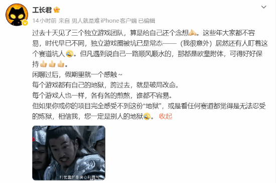 工长君在文中表示,过去十天内他见了三个独立游戏团队,坦言此举是“给自己还个念想”。