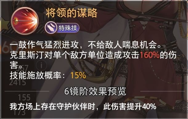 15%概率对单体发动160%攻击的追加伤害,6镜阶后若存在守护伙伴,伤害提升40%。