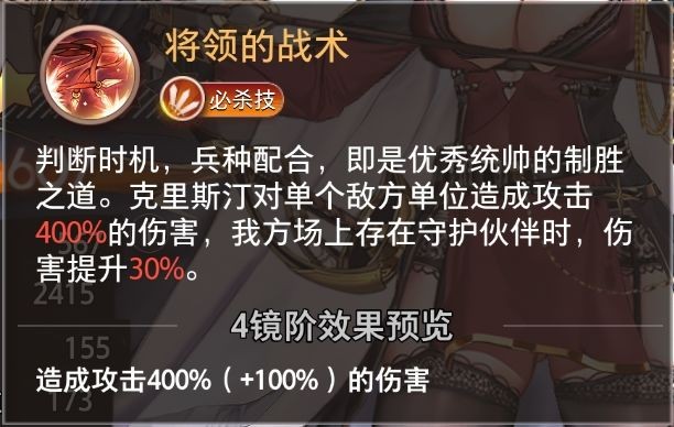 克里斯汀登场时,从我方手牌中随机召唤1名守护伙伴至前排,但降低其35%攻击与生命值。