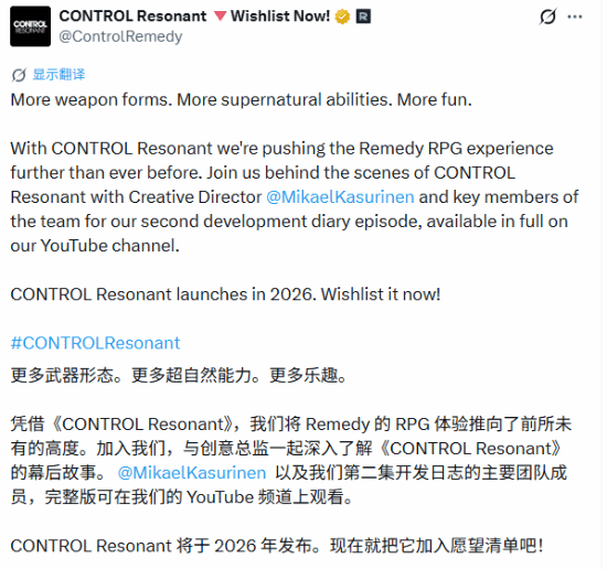 前段时间《控制:共振》官方发布了开发者日志,在其中多位开发者简单讲述了本作的新特点:更多武器形态,更多超自然能力,更多乐趣,并且敌人也会有更多变种。