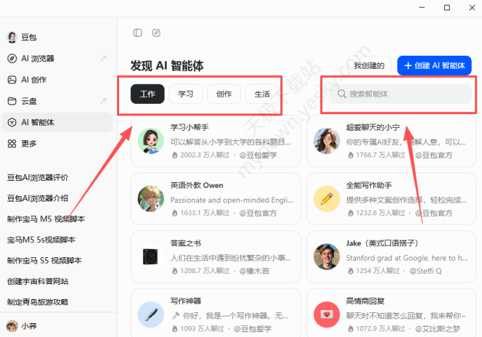 3、在左上角可以区分智能体分类,右上角可以搜索想要使用的智能体。