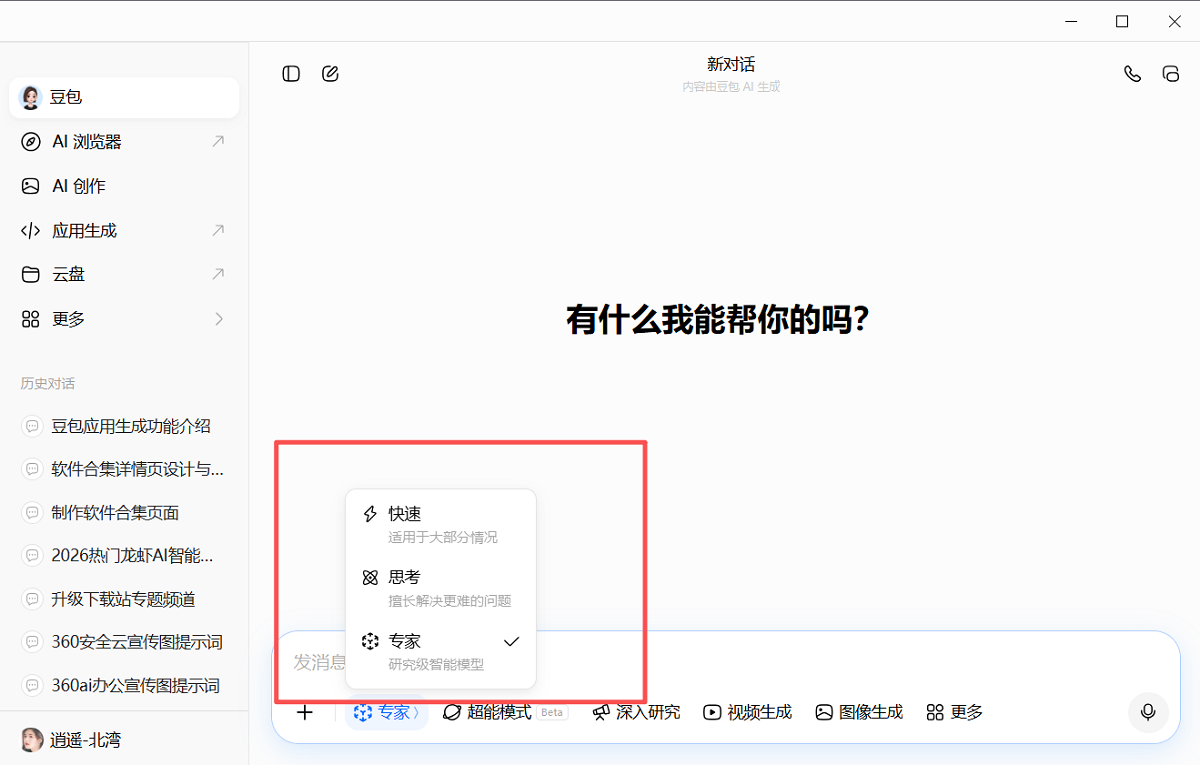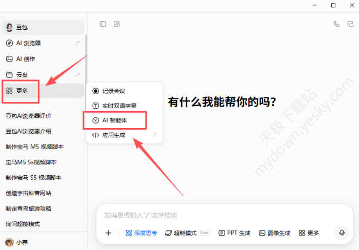 1、打开豆包最新电脑版,在左侧找到【更多】,点击其中的【AI智能体】。