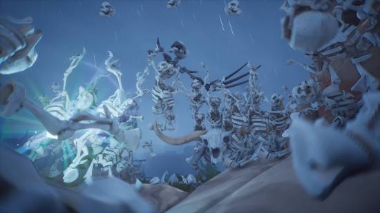 用风滚草和红石峡谷,游戏构建了一个猛一看常规,实际却与大众记忆完全不一样的狂野西部。在尘土飞扬的木制酒馆和无尽沙漠之外,《遥遥西土》的西部是一个充斥着闹鬼矿洞、复活的骷髅大军,还有随时可能冲出来幽灵火车的灵幻世界。