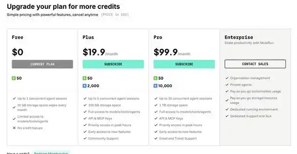 骡子快跑(MuleRun)采用?订阅套餐与按量付费相结合?的收费模式,个人用户起步价约为?19.9 美元/月?。