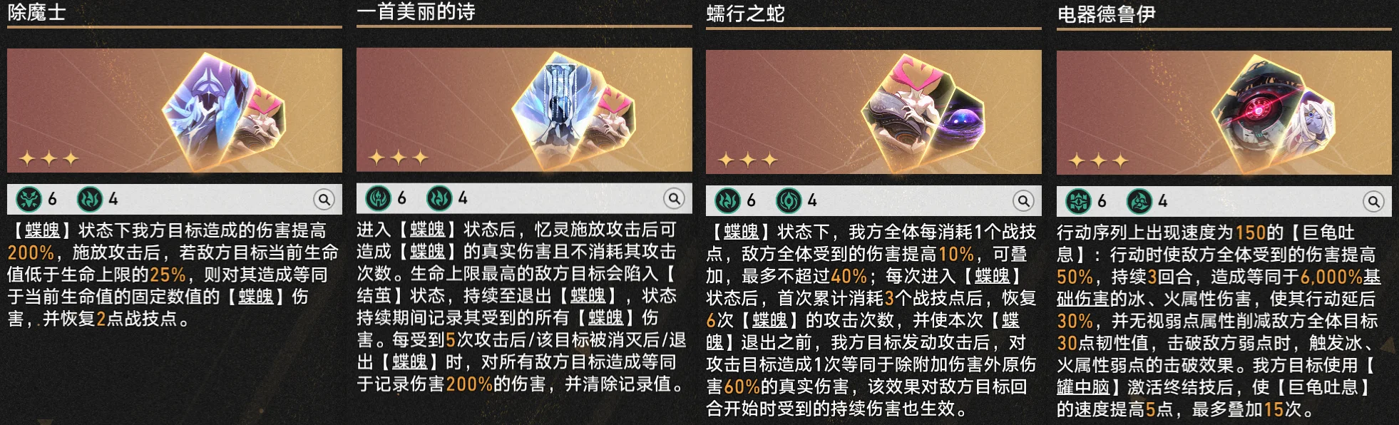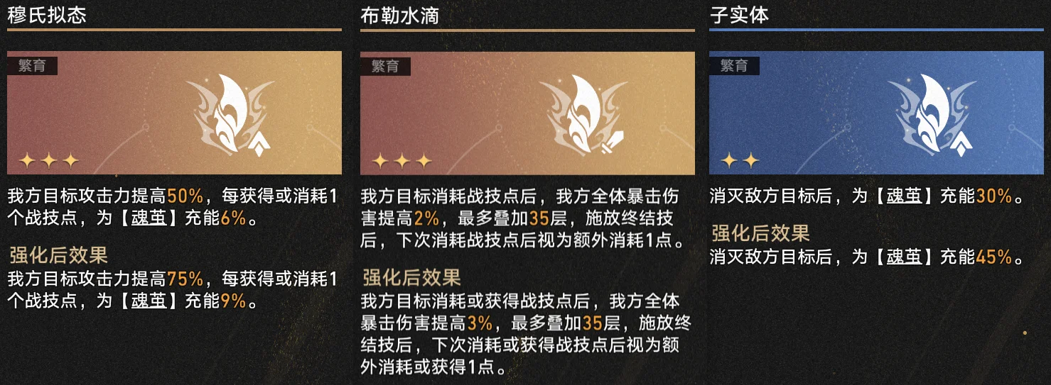 一星方程方面,能够触发相关【繁育】祝福、充能【蝶魄】的【亲密好友】和【技能抓阄赛】最重要;