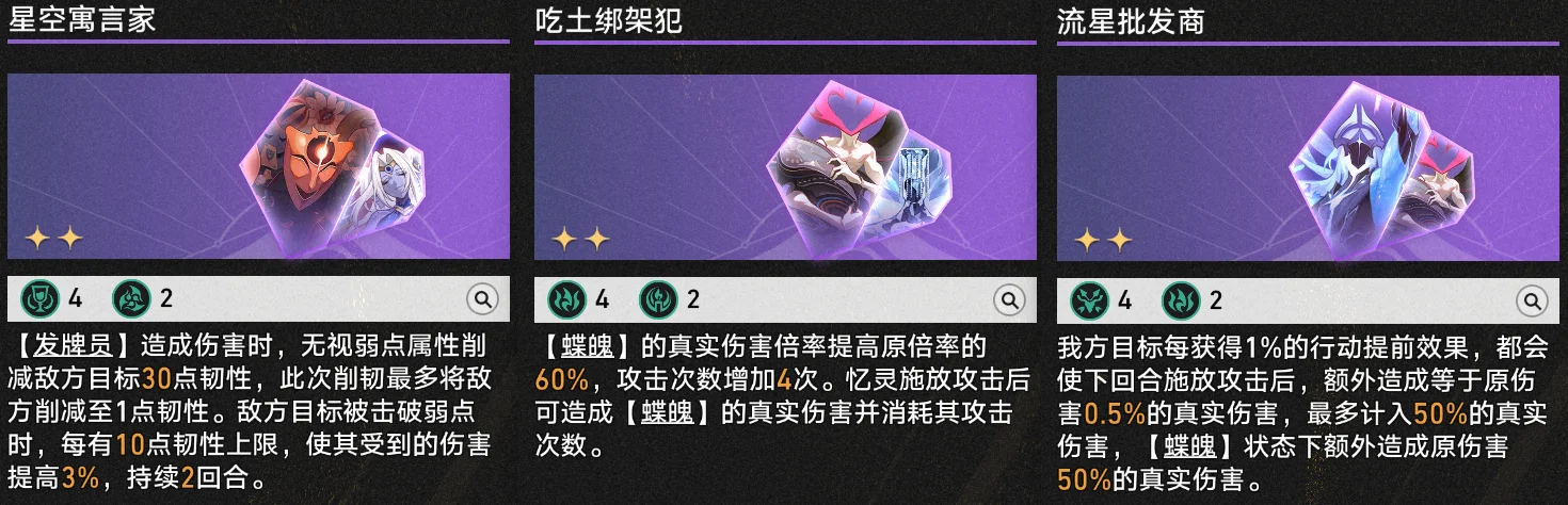 【星空寓言家】可提供一定的易伤效果;【吃土绑架犯】和【流星批发商】则可进一步提升真伤倍率。