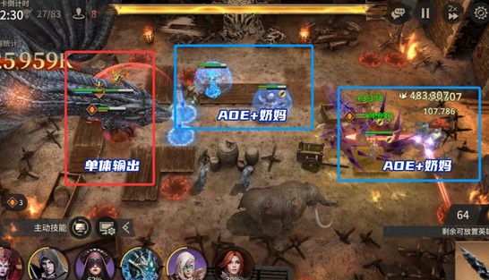 红色地面位部署单体英雄输出伤害。基本操作思路就是放置1名AOE英雄清怪,红色区域部署高爆发英雄打伤害。BOSS会周期性群攻,3个位置都要部署奶妈提供续航(任意奶妈均可)。