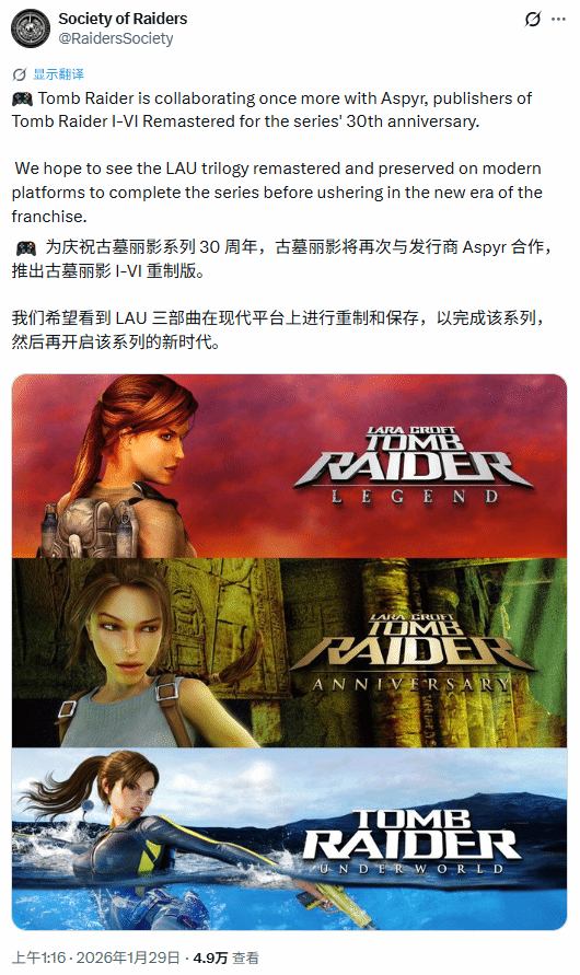 据一个叫Society of Raiders的爆料源透露,之前负责过《古墓丽影1-6》复刻版移植的开发商Aspyr,正在为系列30周年整活儿,目标锁定在了大家口中的LAU三部曲,也就是《古墓丽影:传奇》《古墓丽影:十周年纪念版》和《古墓丽影:地下世界》这三部作品。
