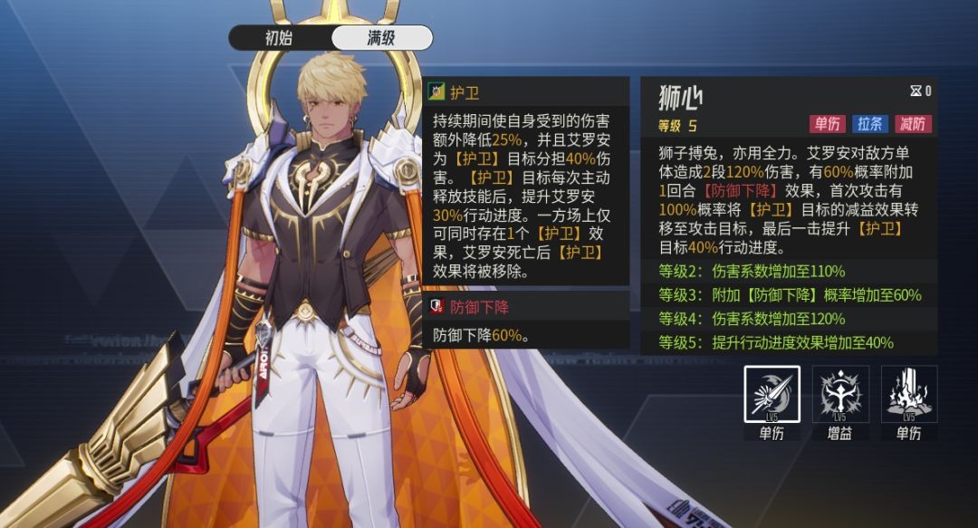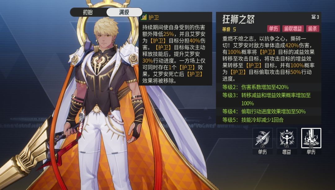 3、【护卫】目标主动释放技能后,提升艾罗安30%行动进度
