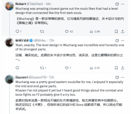 玩家对《明末:渊虚之羽》评价颇高,称赞其关卡设计出彩,作为东方类魂游戏,中后段内容体验极佳;也有玩家吐槽,该作池塘场景的女性Boss难度过高,游玩时倍感挫败。《第一狂战士:卡赞》同样收获玩家认可,有玩家表示,其Boss战设计达到FromSoftware之外的顶尖水平,难度远超《只狼》,是自己玩过最难的类魂作品。