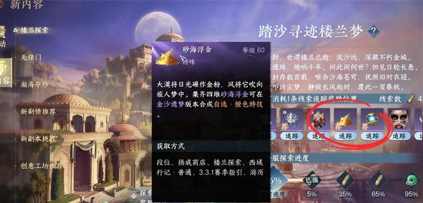 砂海浮金是《逆水寒》楼兰遗梦版本中合成自选金打造的核心材料。玩家只需收集其中4个即可在加工台制作自选金。小编将目前版本全部的砂海浮金获取方式整理了出来,一起来看看今天的逆水寒砂海浮金全获取渠道盘点吧。