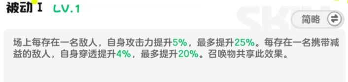 被动1是场上每存在一名敌人,奥丁与召唤物的攻击力提升5%,最多提升25%;每存在一名携带减益的敌人,奥丁与召唤物的穿透提升4%,最多提升20%