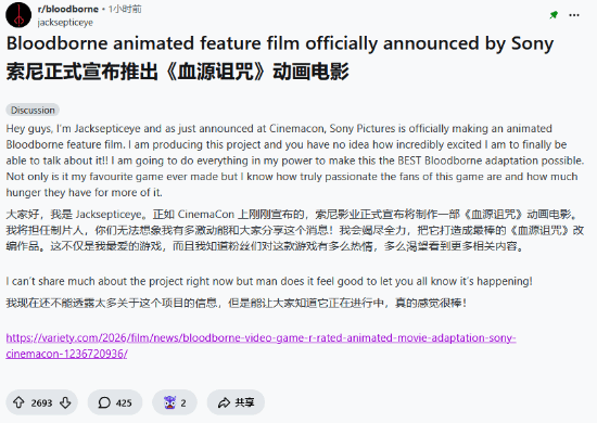 早些时候报道过,索尼在CinemaCon电影展上官宣了一部《血源》的动画衍生电影。随后,该片的制片人也第一时间发声,表示《血源》是自己最钟爱的游戏,没有之一,整个团队会竭尽所能,把这部改编作品做到最好。总比交给一个不了解原作的人强。