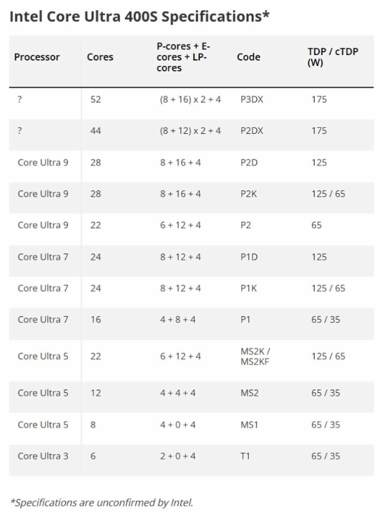 功耗方面,Intel新增175W满血档位,专供52核、44核旗舰,相比当前酷睿Ultra 9 285K基础功耗提升40%。主流解锁版维持125WTDP,同时保留65W、35W低功耗版本,覆盖全场景装机需求。