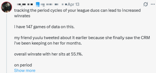 这位ID为SaskioLoL的教练表示,他与一位女性双排队友长期搭档。在记录了队友的生理周期规律后,他发现在经期前后的特定时间段内,双排胜率会出现明显波动。数据显示,避开经期后,他们的胜率能提升大约5%(共统计了147场排位)。