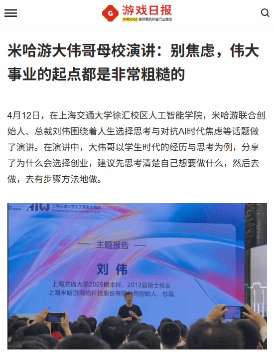 米哈游大伟哥回交大演讲:别太焦虑,真正了不起的事刚起步时往往都很粗糙