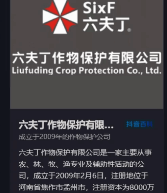 一家叫六夫丁作物保护有限公司的企业,因为自家商标跟《生化危机》里那个臭名昭著的安布雷拉公司(玩家俗称“保护伞”)长得太像,在网络上引发了疯狂玩梗。不少网友直言:“原来保护伞总部藏在河南,做的不是病毒而是杀虫剂?”“难怪丧尸没来中国,全被这公司给灭了。”