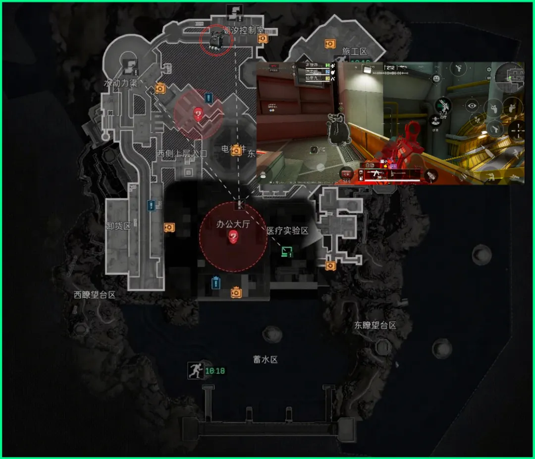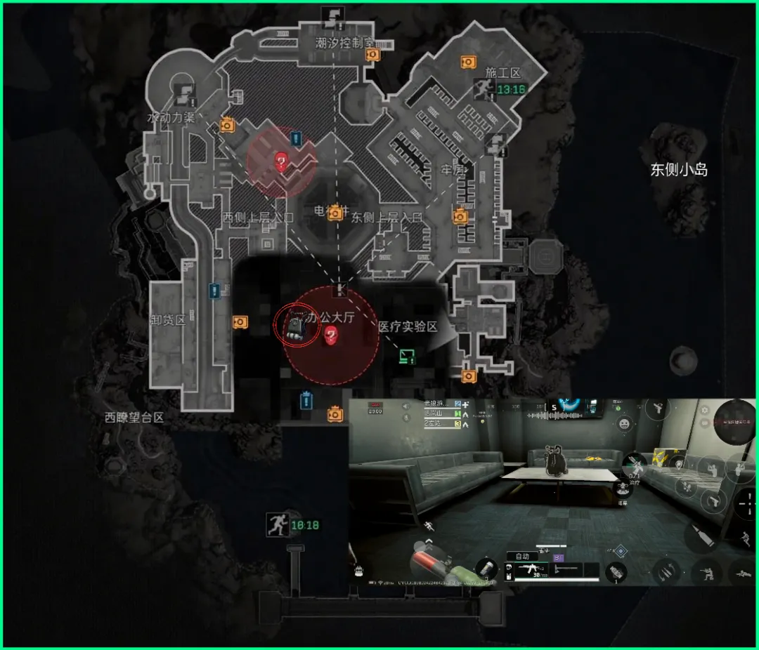 最后一个刷新点在屏蔽区,办公中心!这里不仅会刷浮力补偿设备还会刷雷明顿打字机哦!建议提前标个点,从水道右侧也可以过去!房间中间一个茶几,周围3个大沙发非常明显。