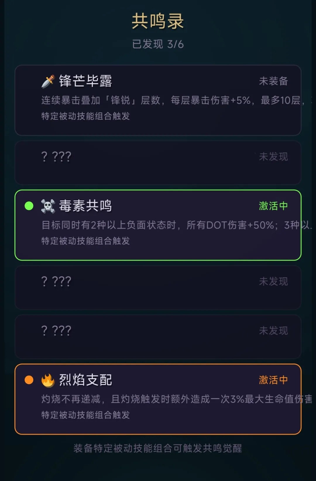 注:毒雾与吸血能触发技能共鸣,大幅强化“烈焰反击”的输出效率,仅有烈焰反击的话很难打死boss。坚韧能提高生存。