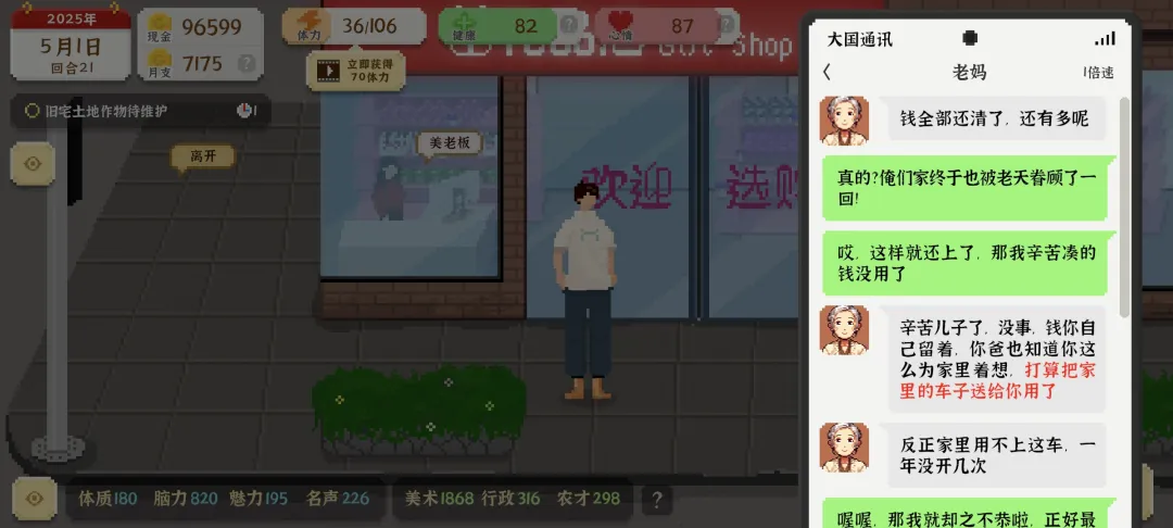 ●10回合 老妈发消息问你以后做什么,看你自己兴趣,我是三手抓,选的第一个,⭐后面有点小时间去跟好感npc处好关系还可以提高三个数值的获取率,艾薇[美术],何子[行政],小花[农业]