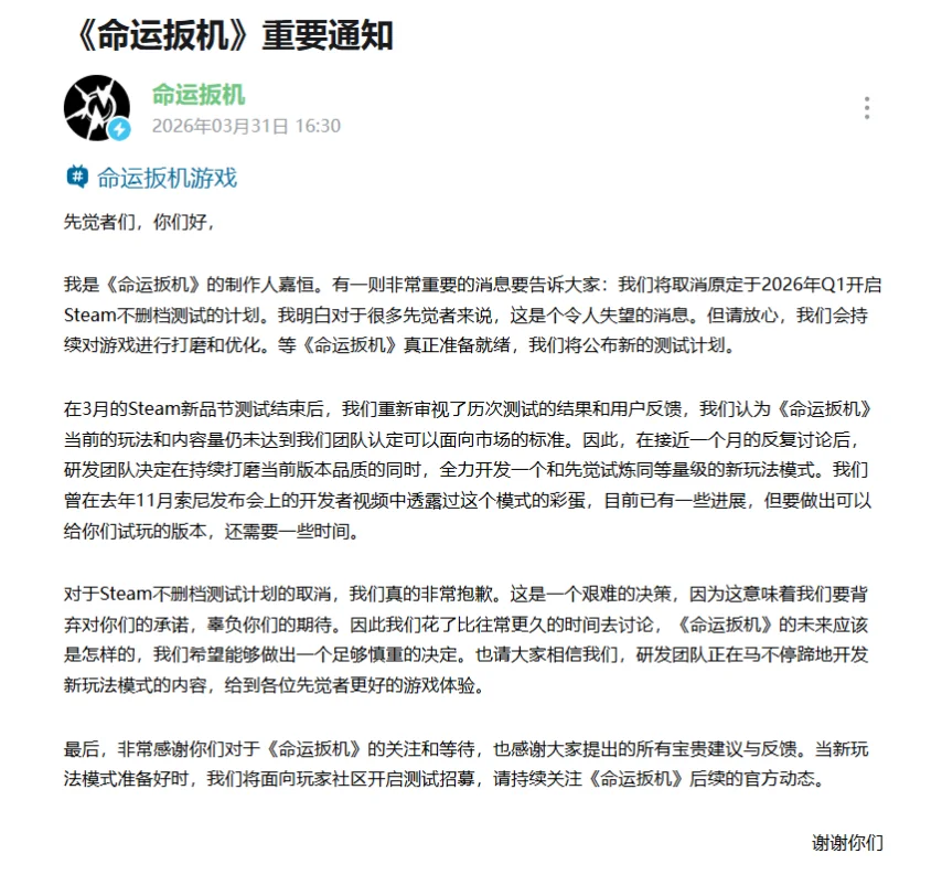 3月31日傍晚,《命运扳机》官方发布公告,表示原定于Q1开启的不删档测试计划取消,游戏将继续打磨优化,重新进行测试。