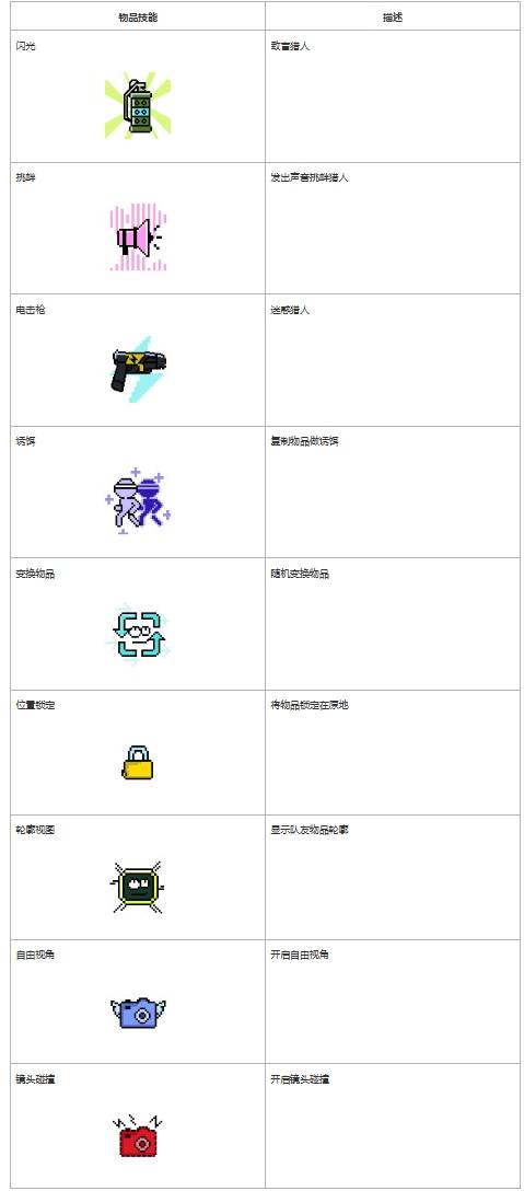 物品:在地图上生成后快速移动,选择伪装物品并寻找藏身之处。